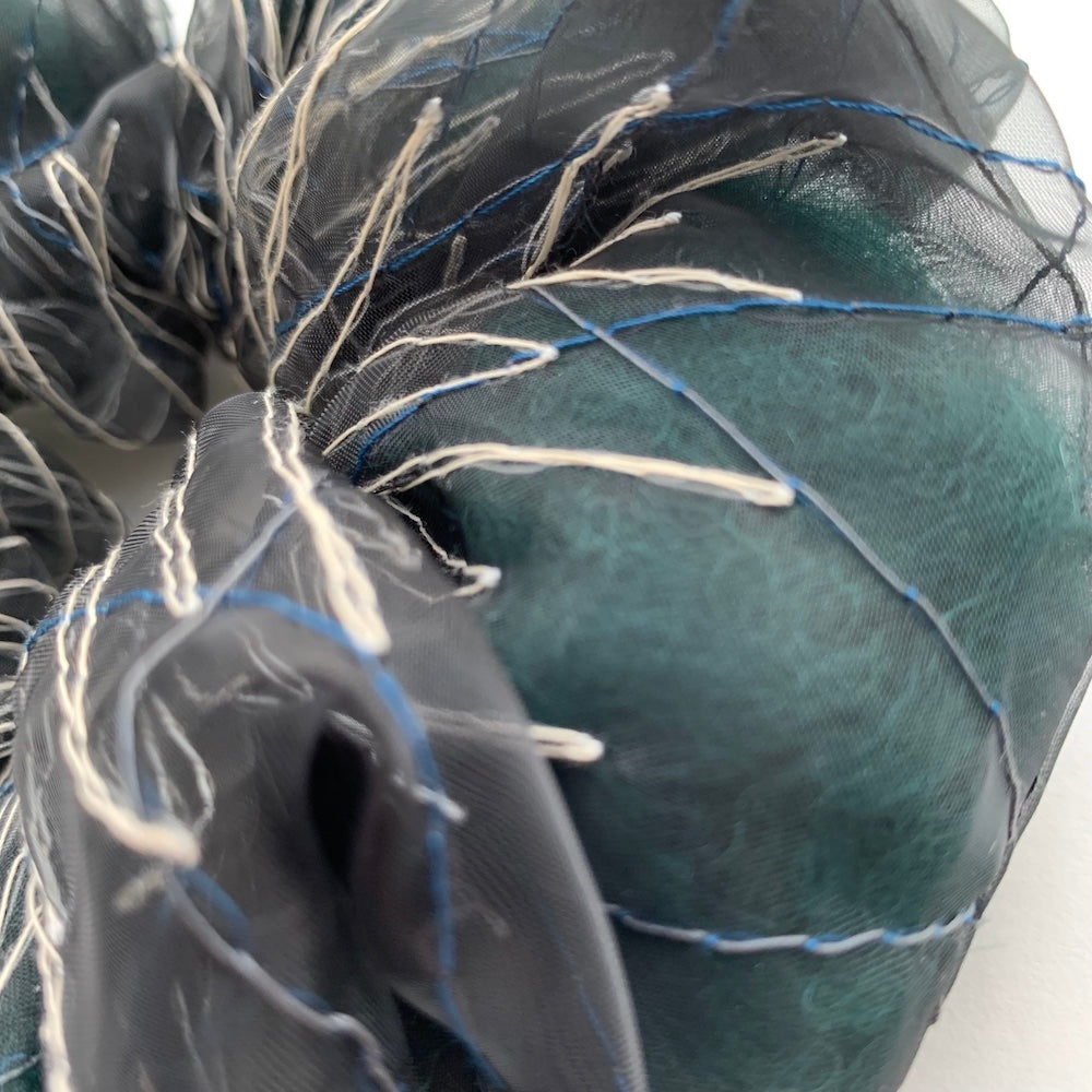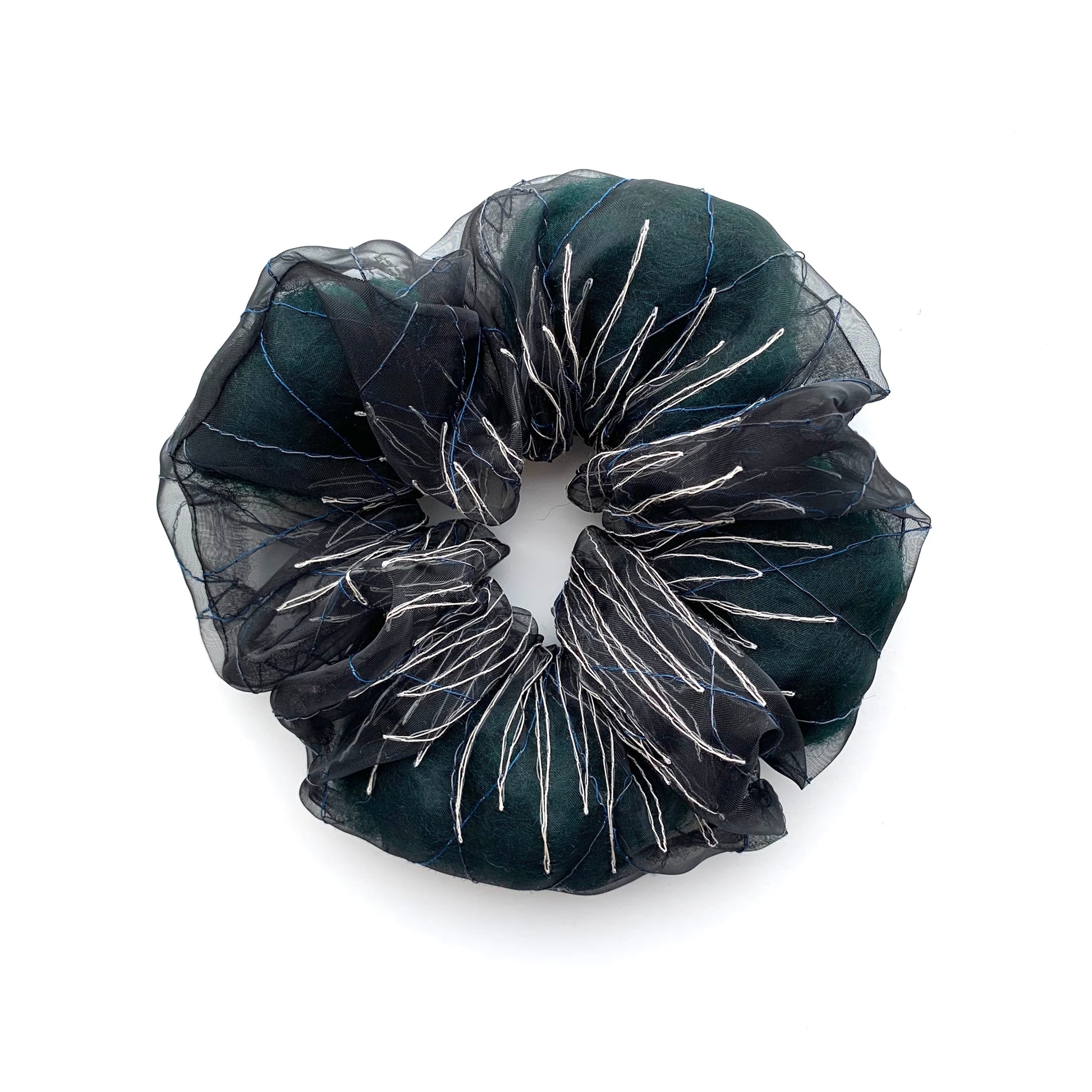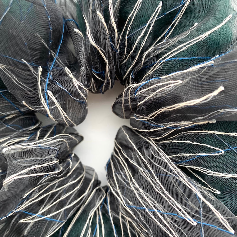 ブラックオーガンジーにモスグリーンカラー羊毛のシュシュ。
